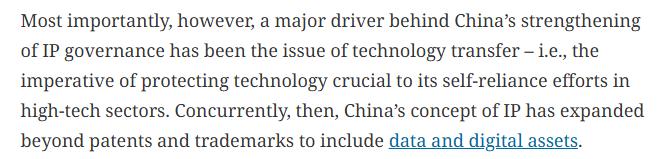 文章指出,推动中国加强知识产权治理的重要动力之一是技术转让问题,这直接关系到高科技领域的创新保护与发展。与此同时,中国的知识产权概念已经从传统的专利、商标等范畴,扩展到了数据和数字资产等新兴领域。