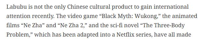文章以中国玩具制造商推出的某款玩偶为例。文章称,这款玩偶风靡全球,已成为一个全球性的文化现象,折射出中国文化软实力的提升。该玩具制造商正在积极学习如何构建长期的IP价值,以应对盲盒模式固有的短期消费特性。据悉,该玩具制造商正在推进的计划包括拓展产品线、建设主题公园、创作相关电影等。